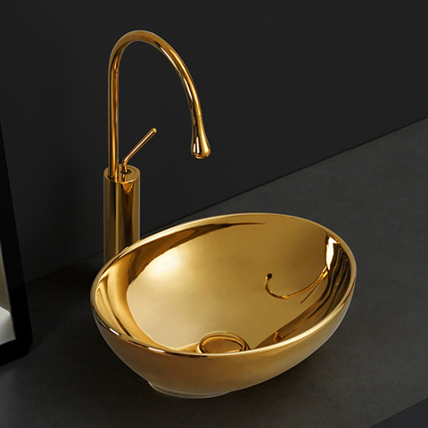 Hiện Đại Sang Trọng Vàng Tay Chậu Rửa Bóng Hình Bầu Dục Truy Cập Hàng Đầu Phòng Tắm Bồn Rửa Gốm Nghệ Thuật Lưu Vực Cho Khách Sạn Biệt Thự Căn Hộ